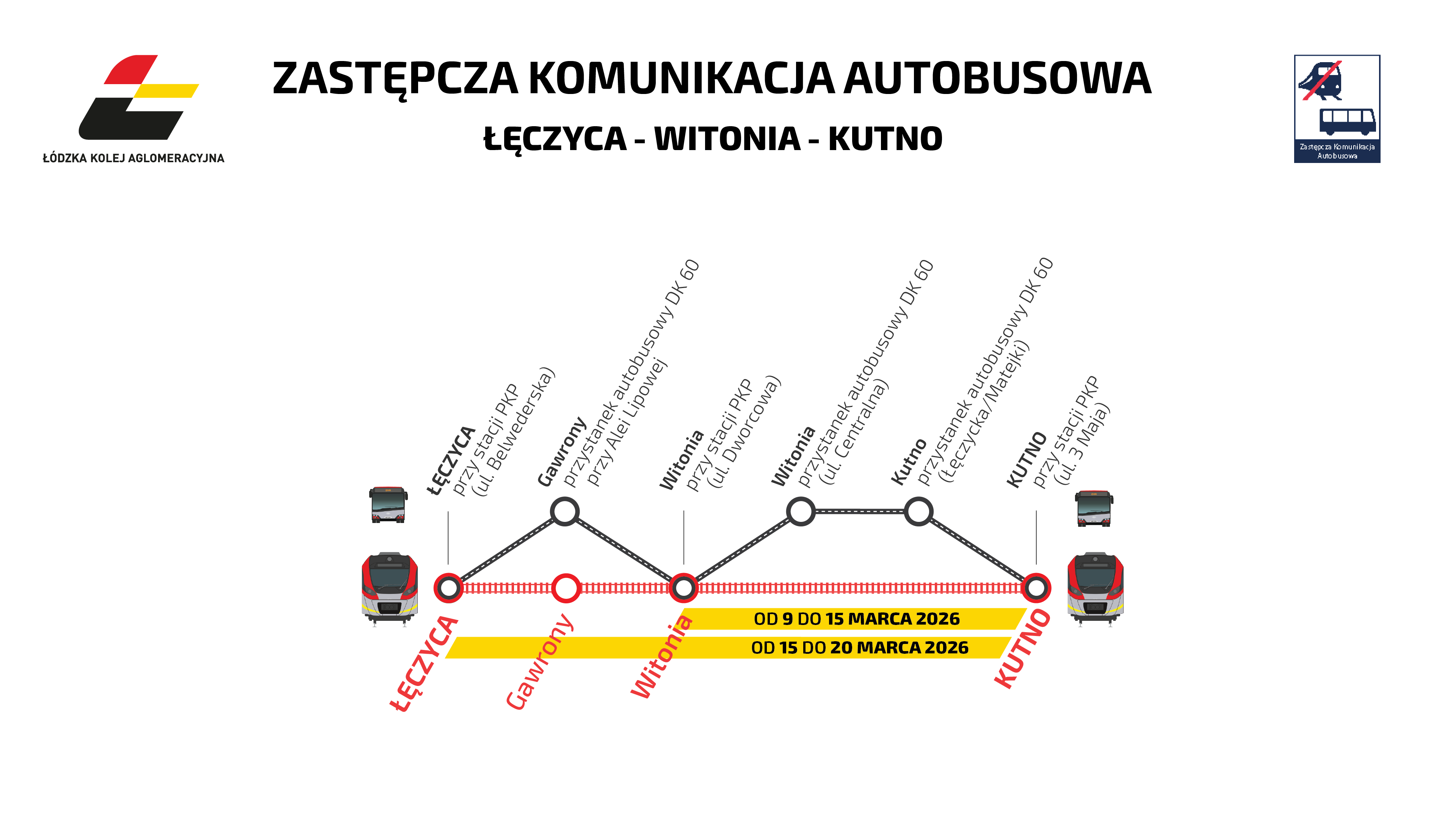 W związku z realizacją zadania pn. „Budowa mostu przy ulicy Prymasowskiej” w Skierniewicach od dnia 18 marca 2026 r. do odwołania autobusy realizujące zastępczą komunikację na odcinku Kutno – Łowicz Główny – Skierniewice będą kursowały objazdem. Przystanek w Skierniewicach przy ul. Prymasowskiej zostaje przeniesiony na ul. Reymonta. Autobusy mogą doznawać opóźnień.